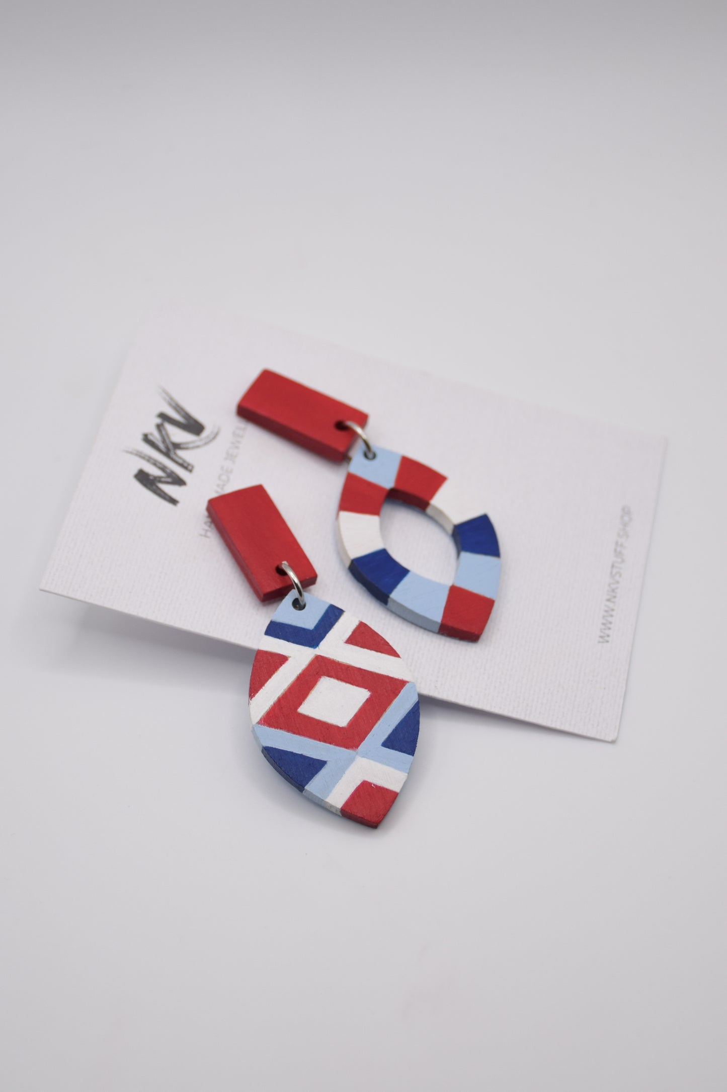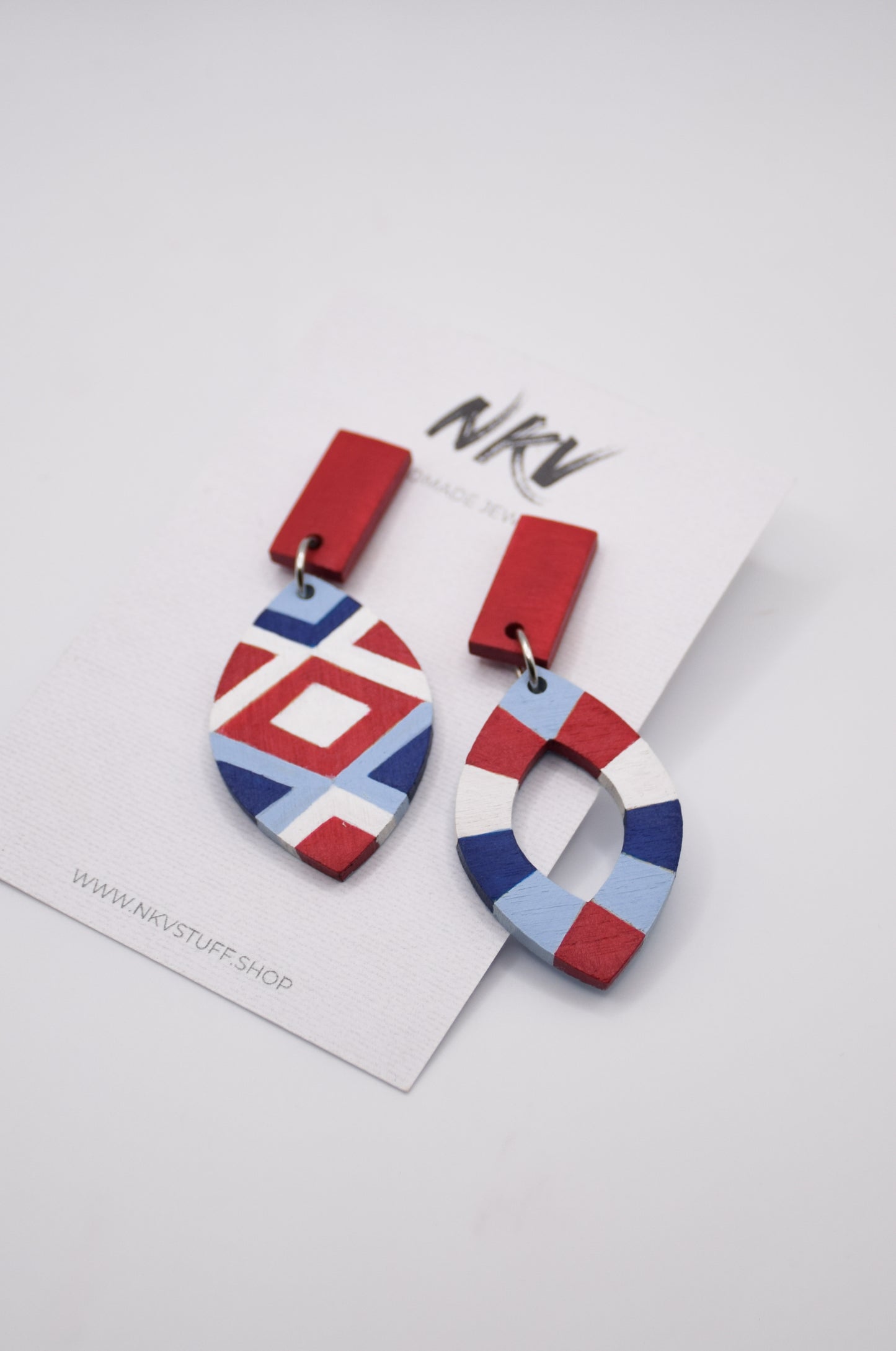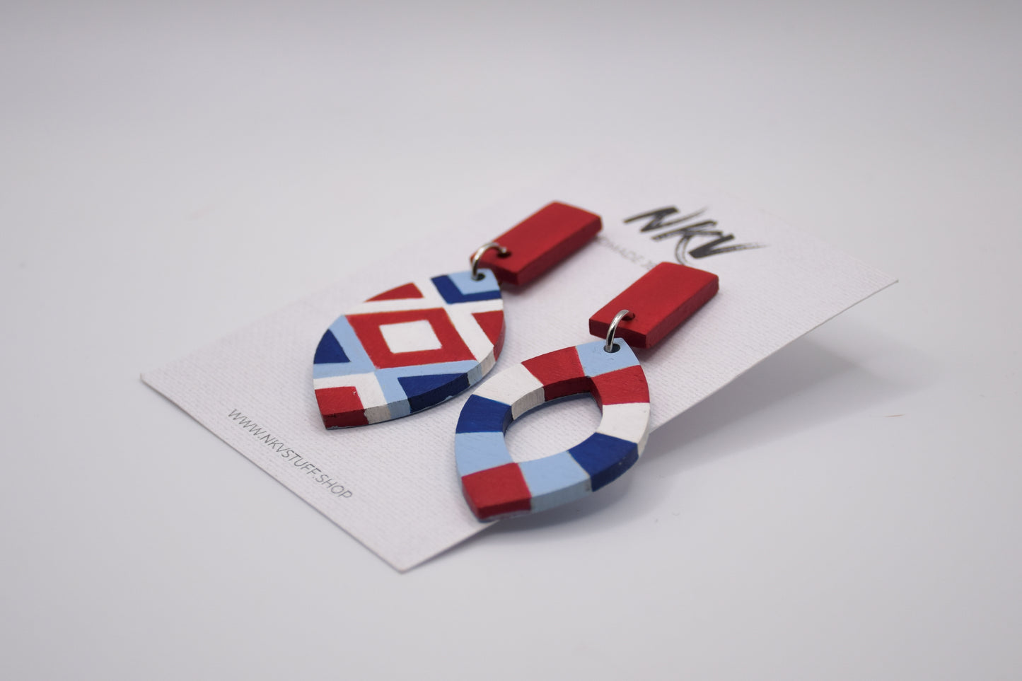 Discover the Marinero earrings, where bold shades of red, white, and blue evoke the essence of the sea. The playful composition of geometric shapes creates a modern, dynamic look while radiating timeless elegance. Each piece is hand painted on a wooden base, making it a unique, miniature work of art – the perfect accessory to elevate both everyday and special occasion outfits.