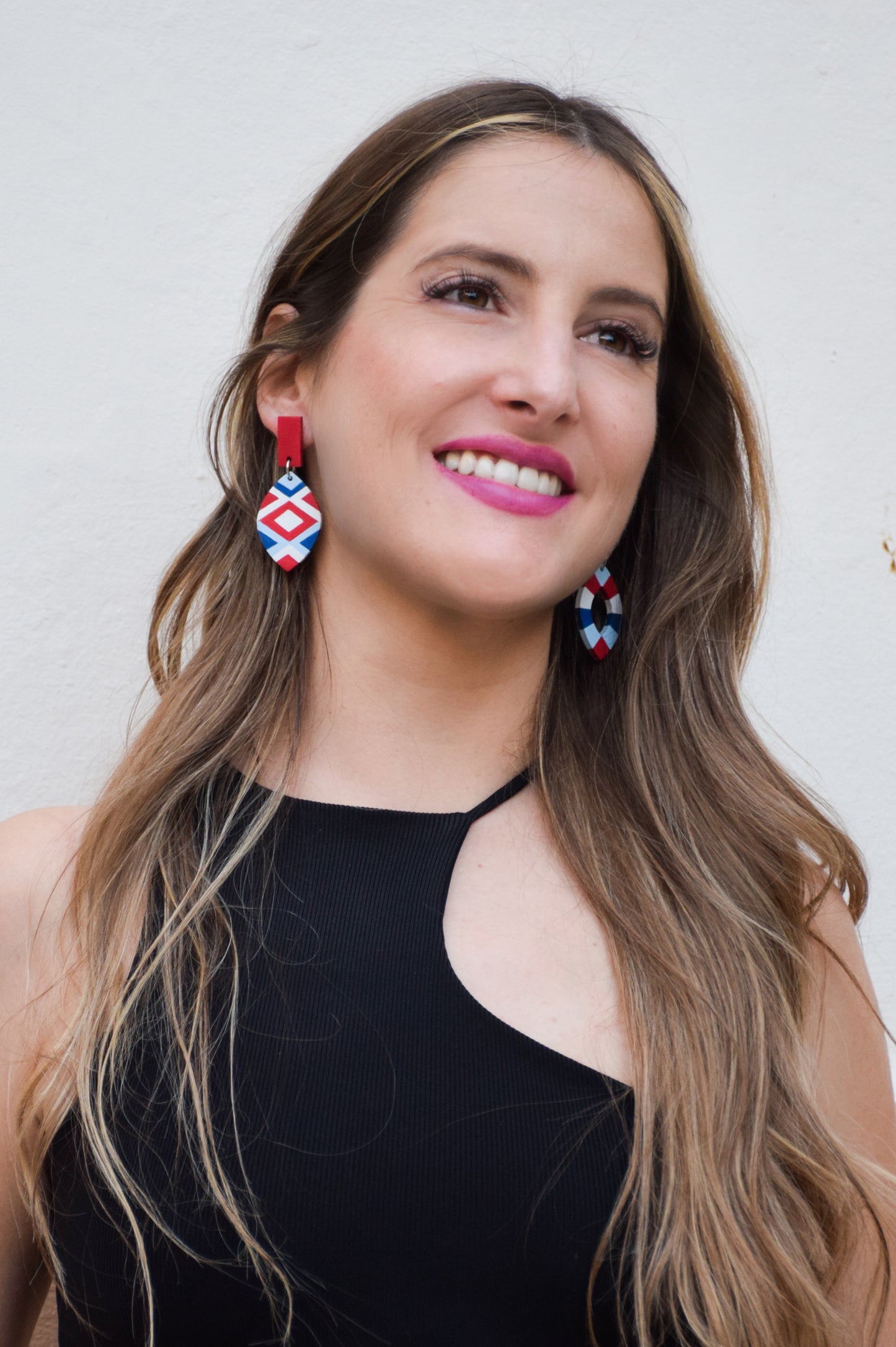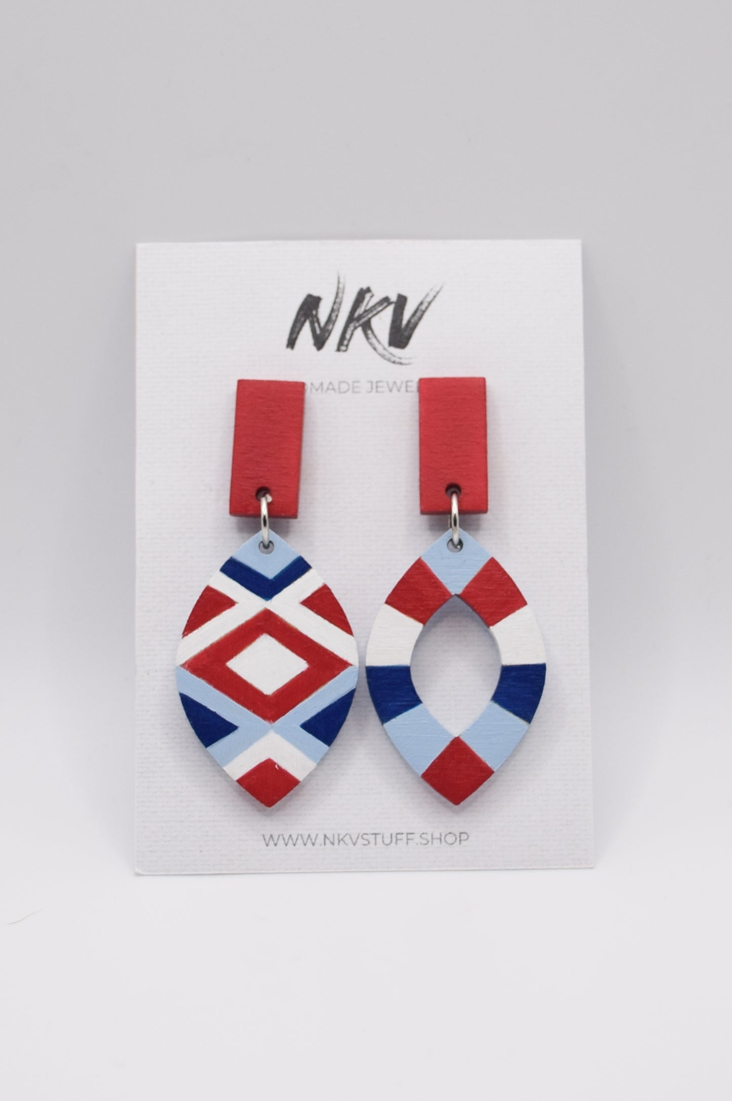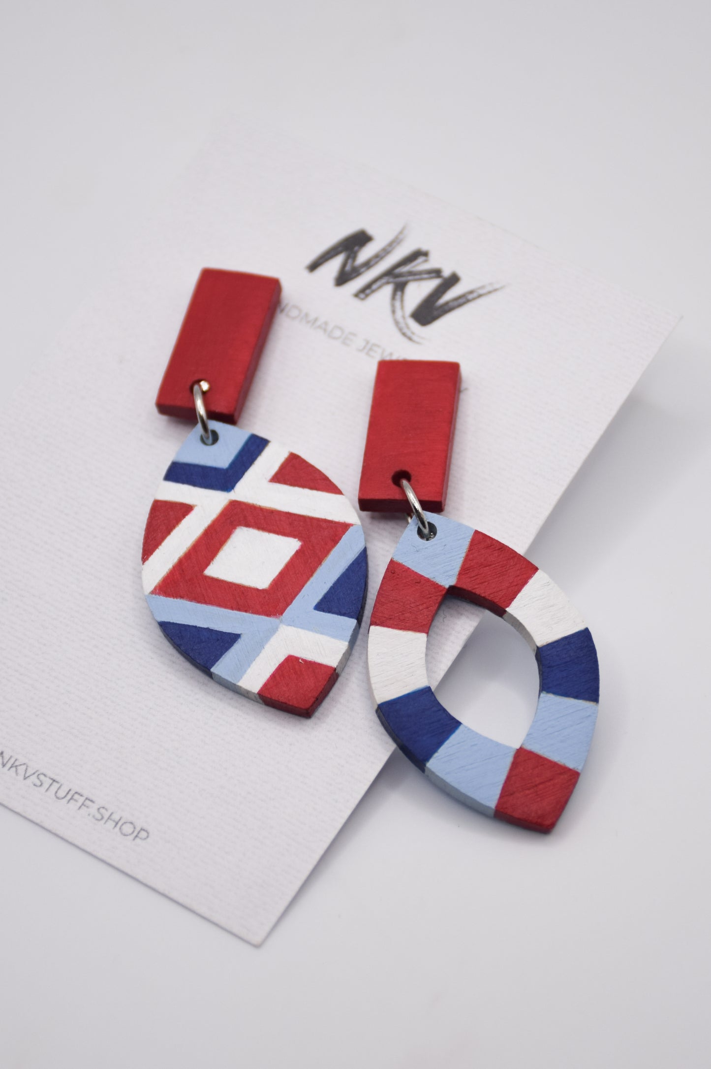 Discover the Marinero earrings, where bold shades of red, white, and blue evoke the essence of the sea. The playful composition of geometric shapes creates a modern, dynamic look while radiating timeless elegance. Each piece is hand painted on a wooden base, making it a unique, miniature work of art – the perfect accessory to elevate both everyday and special occasion outfits.